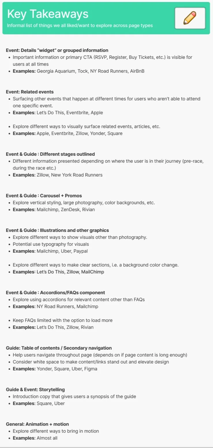 We took a look at what our competitors were doing when jumping to a new page type, i.e. looked at New York Road Racer’s when on the event page type. We then marked it with notes before creating key takeaways from what everyone brought together.